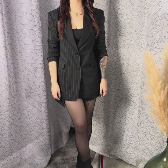 Le blazer bi color Anissa associe un noir profond à rayure discrètes pour un style moderne et affirmé.