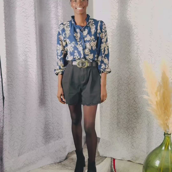 Son motif baroque marine et écru apporte du relief à la silhouette, tandis que sa coupe fluide accompagne les mouvements avec élégance. Son col mao et ses manches longues légèrement bouffantes jouent entre allure citadine et esprit bohème.