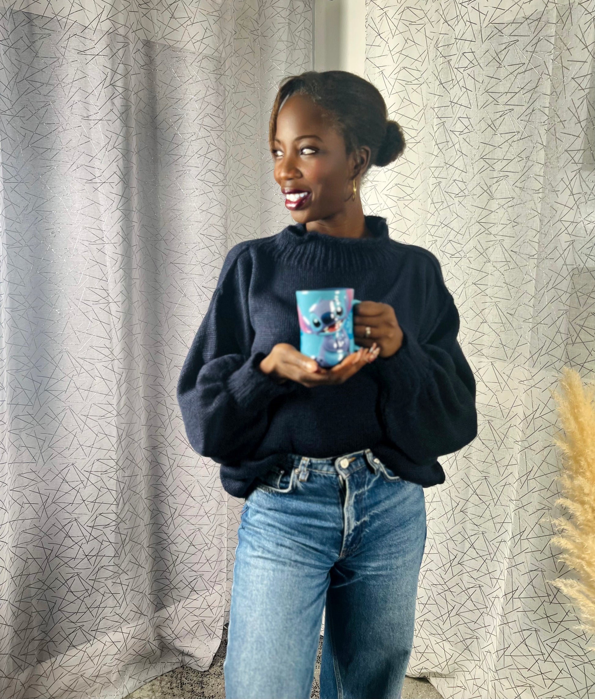 Ce pull oversize en maille chaude, d’un joli bleu marine, est un véritable coup de cœur.