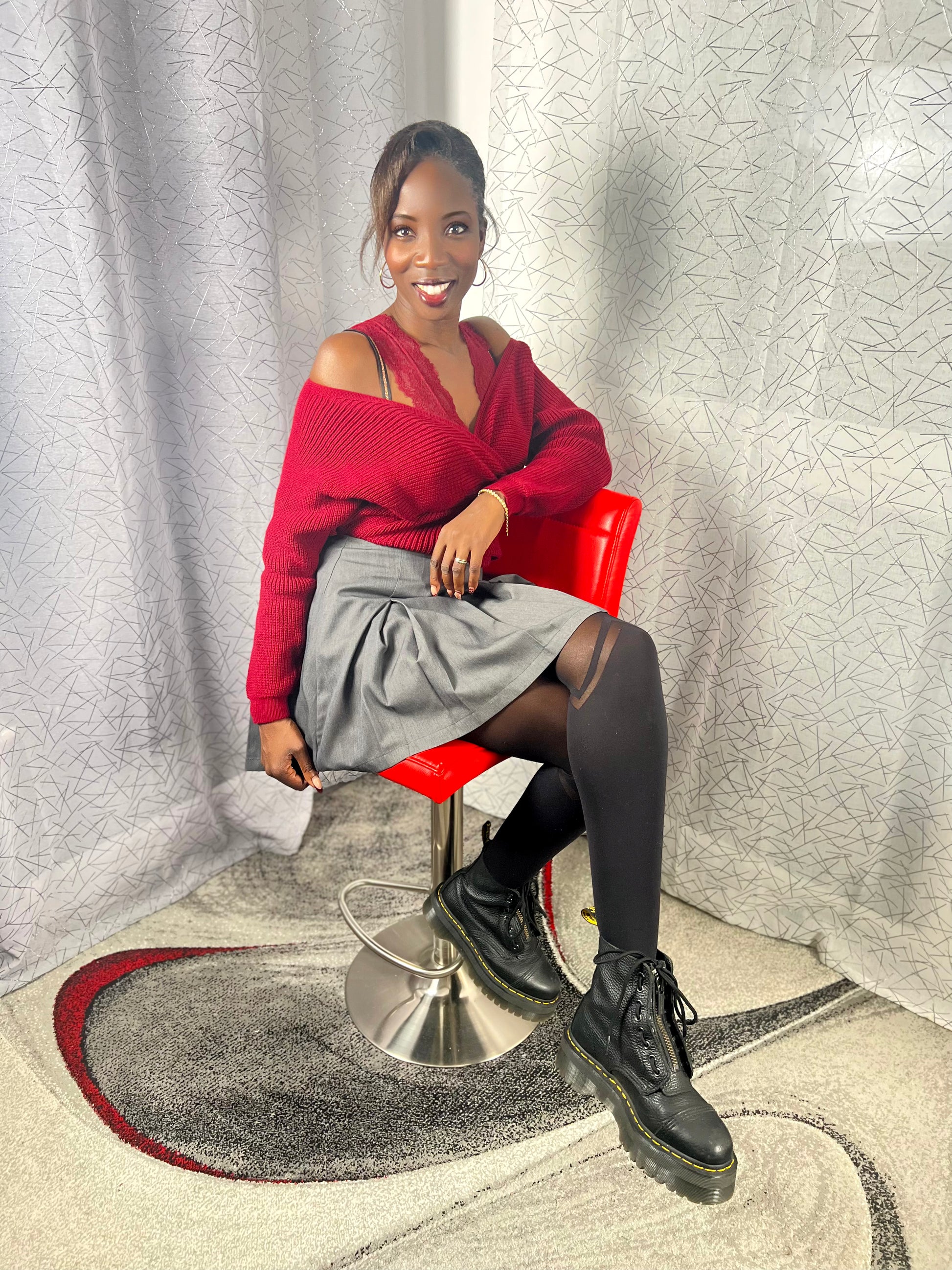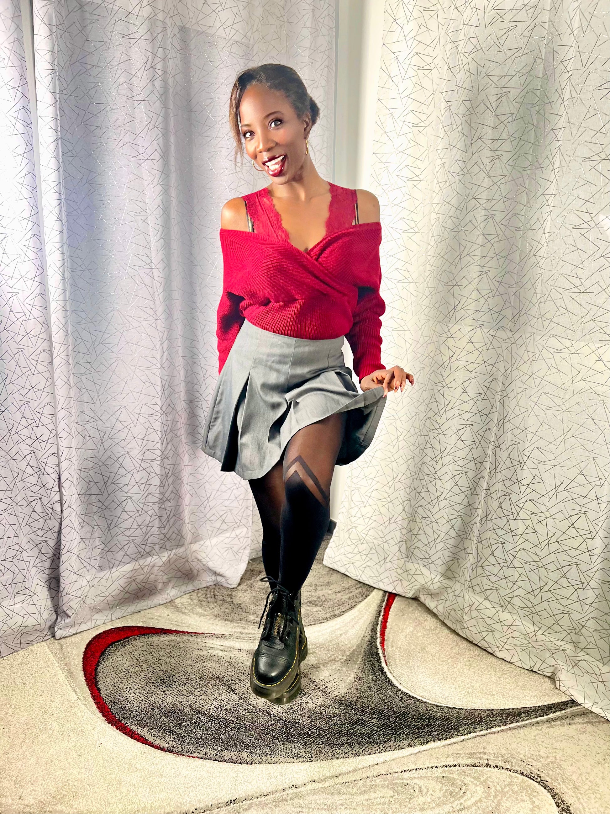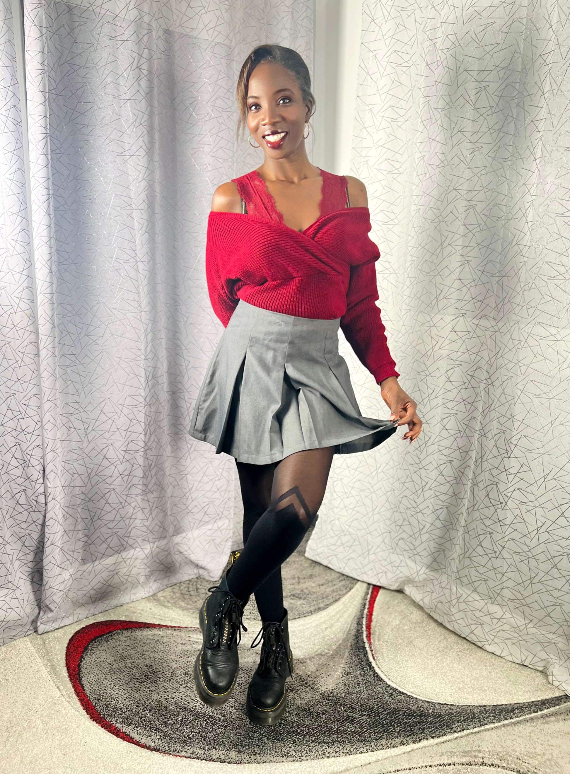 Voici notre pull Sofia en maille bordeaux à manches longues avec un decolleté en dentelle assortie.